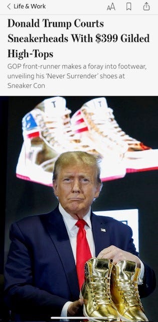 I was in the US last week, taking the temperature of work on the East Coast and I went to Philadephia, or ‘Philly’ which, coincidentally (although we did not coincide) was where Sneaker Con was held at which one D. Trump launched his latest bizarre scheme. I think this guy likes selling. Anything. Politics is pure product to him, no?